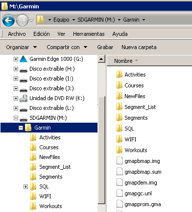 Si todo ha ido bien, en el Explorador de Windows u OSX, aparecerá una unidad, o dos unidades, de almacenamiento que antes no teníamos. Aparecen dos unidades si el dispotivo tiene insertada una tarjeta SD externa. En la imagen de la derecha vemos que aparece una unidad de almacenamiento "Garmin Edge 1000" y otra unidad, correspondiente a la tarjeta SD, que hemos renombrado como SDGarmin para reconocerla rápido si la insertamos en otros dispositivos u ordenadores.
